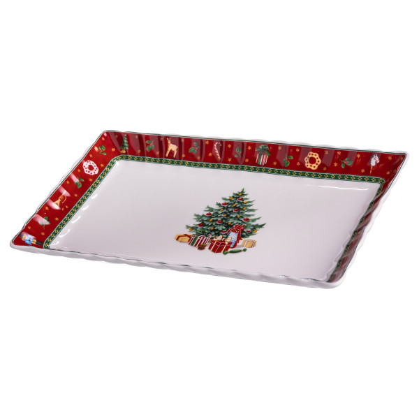 Это большое прямоугольное блюдо создано для элегантной и торжественной подачи блюд на новогоднем или рождественском столе. Сочетание классического рисунка, яркого борта и фигурного края делает его настоящим украшением сервировки.