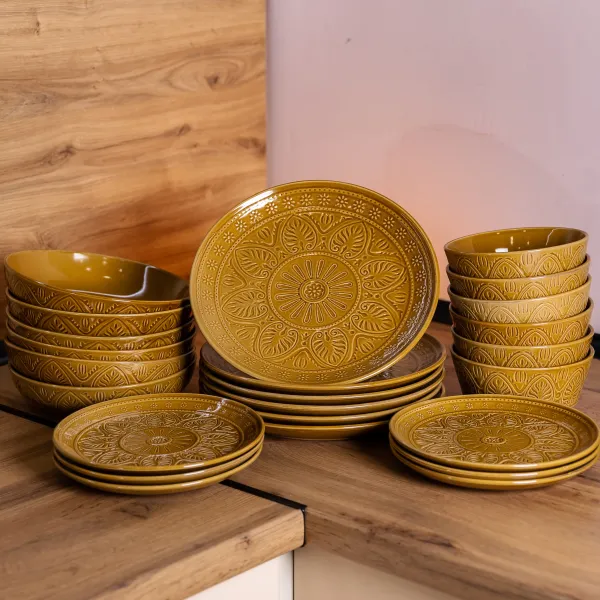 В комплект входят обеденные тарелки (26,5 см, высота 2 см), десертные тарелки (21 см, высота 1,5 см), суповые тарелки (21 см, высота 4,5 см) и салатники (15 см, высота 6,5 см). Все предметы имеют стандартные размеры, подходящие для ежедневного использования и сервировки стола.