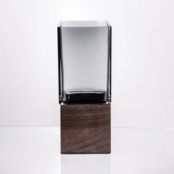 Эффектная ваза, сочетающая прозрачность стекла и тёплую фактуру натурального дерева. Строгие геометрические формы и минималистичный дизайн делают её универсальным элементом декора: подойдёт как для современных интерьеров в стиле минимал и скандинавского уюта, так и для контрастных акцентов в классических помещениях.