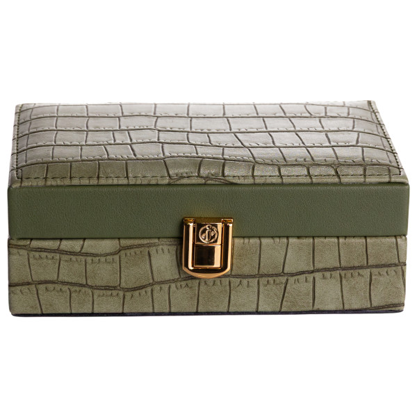 Внутрішній простір поділений на три комірки для зручного сортування прикрас, годинників або інших дрібних аксесуарів. На внутрішній стороні кришки розміщене дзеркало, що додає практичності під час використання. Внутрішнє покриття з велюру сприяє дбайливому зберіганню виробів і зменшує ризик подряпин.