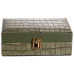 Зовнішня поверхня виконана з екошкіри з текстурою під шкіру крокодила у вигляді прямокутних «лусочок». М’яка кришка створює акуратний завершений вигляд, а металева защіпка золотистого відтінку, розташована по центру передньої частини, забезпечує надійну фіксацію. Така конструкція допомагає захистити вміст від пилу та випадкових пошкоджень.