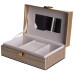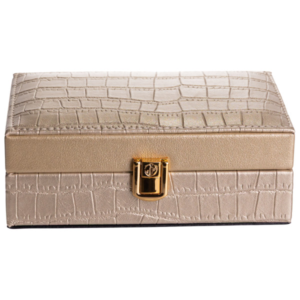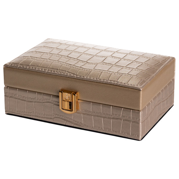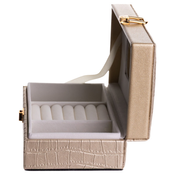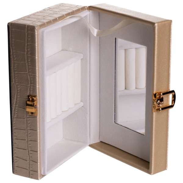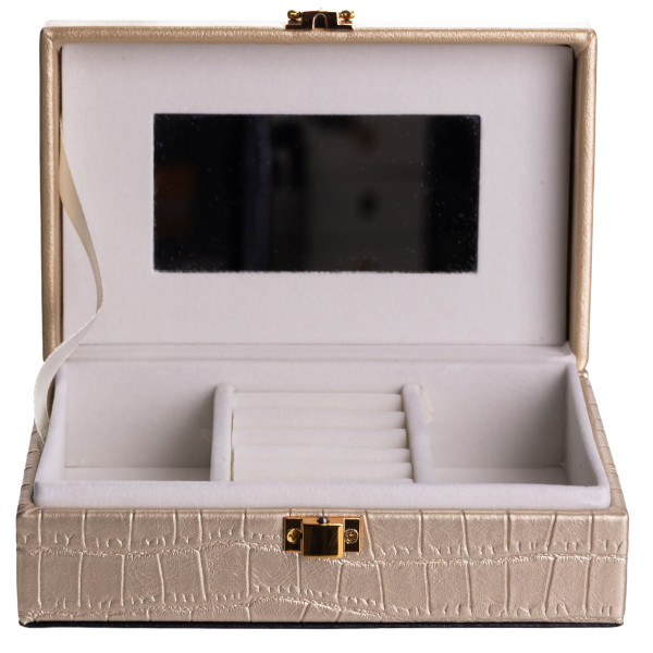 Внутрішній простір поділений на три комірки для зручного сортування прикрас, годинників або інших дрібних аксесуарів. На внутрішній стороні кришки розміщене дзеркало, що додає практичності під час використання. Внутрішнє покриття з велюру сприяє дбайливому зберіганню виробів і зменшує ризик подряпин.
