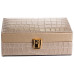 Скринька для зберігання прикрас із екошкіри допомагає впорядкувати аксесуари та зберігати їх в одному місці. Прямокутна форма забезпечує зручне розміщення на полиці, комоді або в шафі, не займаючи багато простору. Компактні розміри дозволяють використовувати її як вдома, так і під час подорожей.