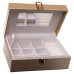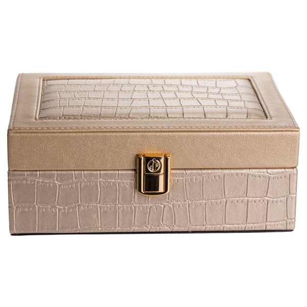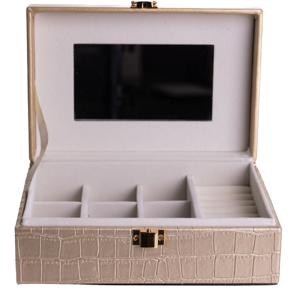 Внутрішній простір поділений на 10 комірок для впорядкованого розміщення прикрас різного типу. На внутрішній стороні кришки розміщене дзеркало, що додає практичності під час використання. Велюрове покриття всередині сприяє дбайливому зберіганню виробів і допомагає зменшити ризик подряпин.