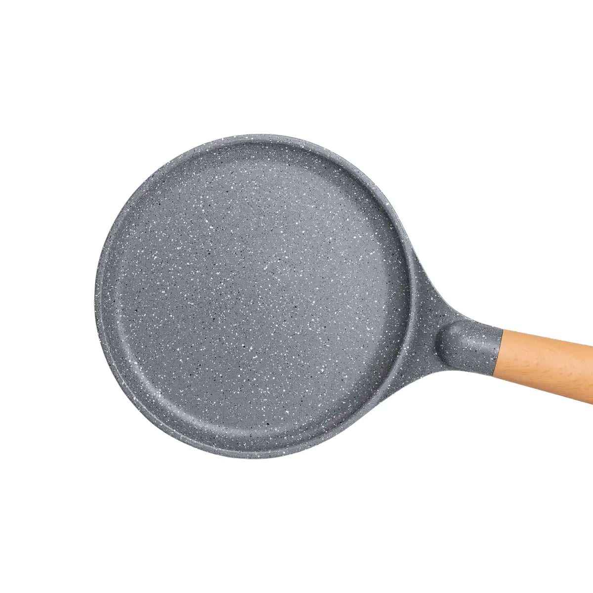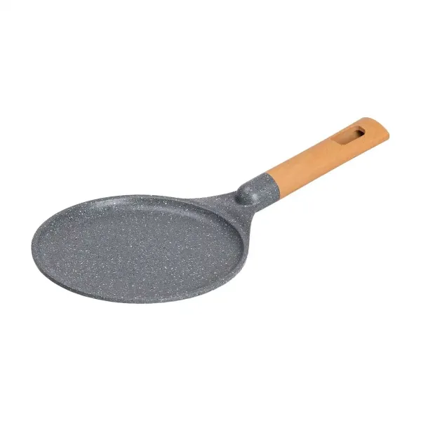 Завдяки діаметру 20 см сковорода підходить для приготування млинців різного розміру, дозволяючи швидко смажити кілька порцій поспіль. Її низькі борти забезпечують зручне перевертання, а товщина дна 5 мм гарантує рівномірне нагрівання та стійкість на плиті.