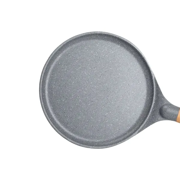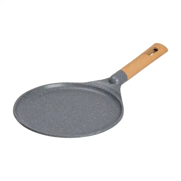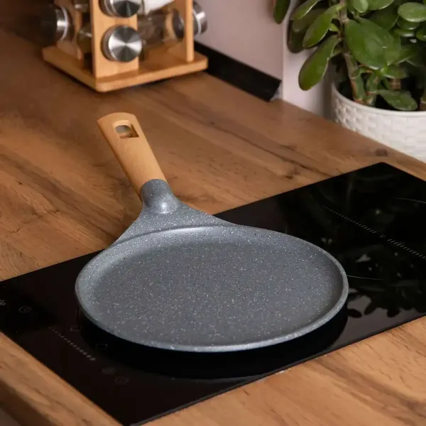 Діаметр 24 см дозволяє готувати млинці великого розміру, що ідеально підходить для сімейних трапез або частувань гостей. Завдяки низьким бортам можна легко перевертати млинці, а товщина дна 5 мм забезпечує рівномірний розподіл тепла та стабільність при використанні на різних типах плит.