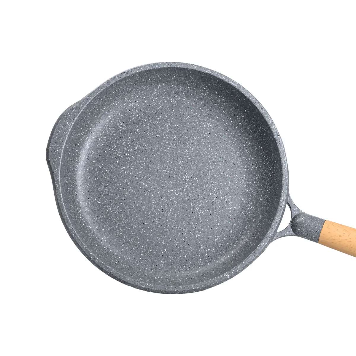 Сковорода діаметром 28 см – універсальний варіант для приготування різноманітних страв. Посуд виготовлений з литого алюмінію, добре проводить тепло та забезпечує рівномірний прогрів інгредієнтів. Сковорода має антипригарне мармурове покриття, завдяки чому можна готувати страви з мінімальною кількістю олії, а гладка внутрішня поверхня полегшує миття.