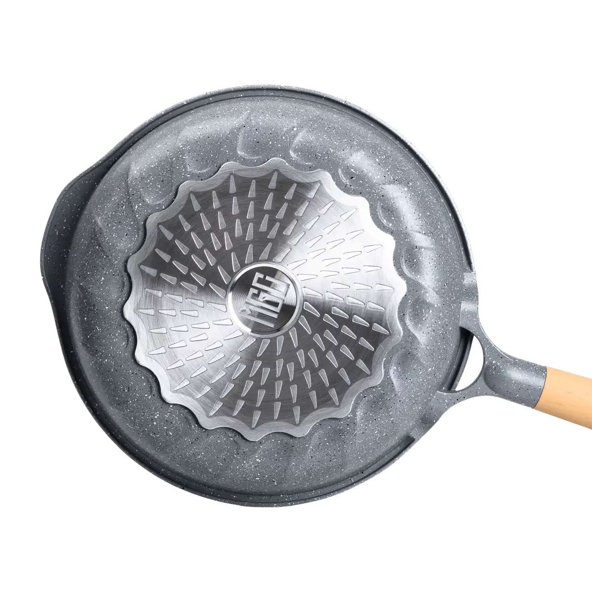 - Для миття після використання не слід застосовувати жорсткі мочалки, скребки, абразивні та агресивні речовини. Для видалення частинок їжі, що пригоріли, і нагару слід замочити сковороду в теплій воді. Розпочинати миття сковороди слід лише після її остигання.