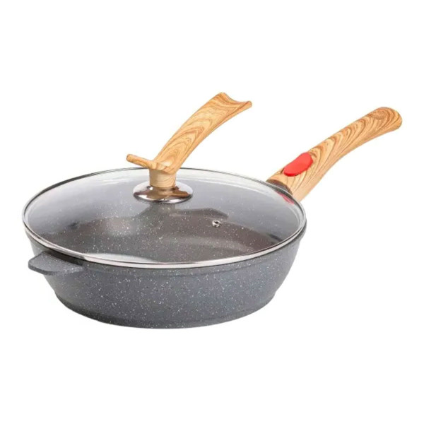 Сковорода діаметром 28 см – універсальний варіант для приготування різноманітних страв. Посуд виготовлений з литого алюмінію, добре проводить тепло та забезпечує рівномірний прогрів інгредієнтів. Сковорода має антипригарне керамічне покриття, завдяки чому можна готувати страви з мінімальною кількістю олії, а гладка внутрішня поверхня полегшує миття.