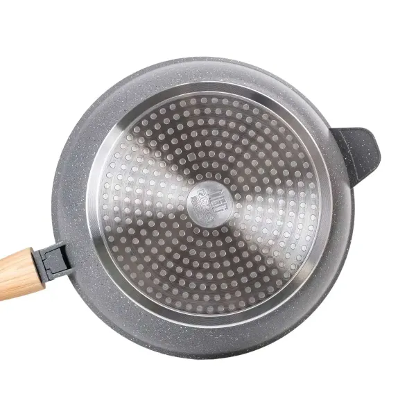 Для зручності використання посуд має знімну бакелітову ручку, яка не нагрівається та мінімізує ймовірність отримання опіків, а також дозволяє легко знайти для сковорідки місце в кухонній шафці.