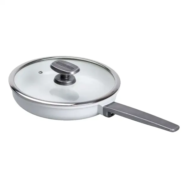 Сковорода діаметром 24 см - відмінний вибір для приготування їжі на кілька осіб або для невеликої родини. Посуд виготовлений з литого алюмінію, добре проводить тепло і забезпечує рівномірне приготування. Сковорода має антипригарне керамічне покриття, завдяки чому можна готувати страви з мінімальною кількістю олії, а гладка внутрішня поверхня полегшує миття.