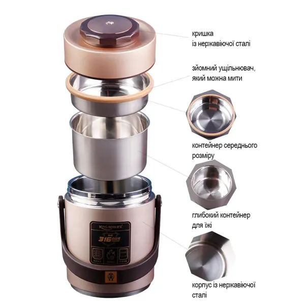 Термос складається з двох контейнерів, що дозволяє вам брати з собою різні страви. Контейнери герметично закриваються силіконовими ущільнювачами, що запобігає протіканню та змішуванню запахів. Термос також має зручну гвинтову кришку, яка щільно закривається і запобігає втраті тепла. А зручна ручка дозволяє легко його переносити.