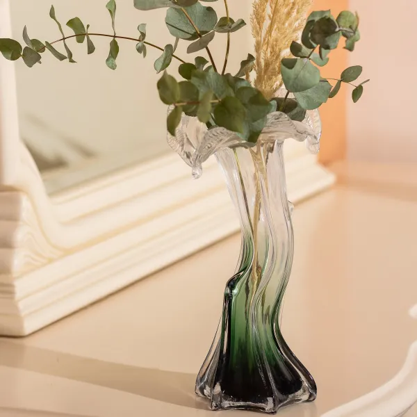 Оригінальний дизайн із хвилястими краями та поєднанням прозорого і зеленуватого скла робить вазу помітною деталлю інтер’єру. Вона підходить як для класичних, так і для сучасних стилів оформлення простору, додаючи акцент у декор житлових і комерційних приміщень.