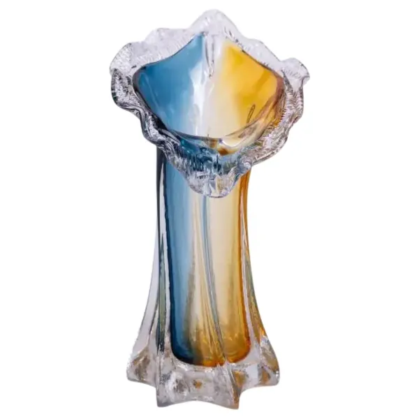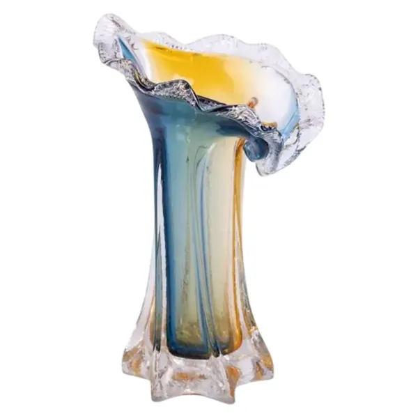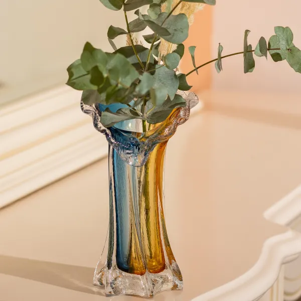 Скляна ваза Crystal Coast ручної роботи – це вишуканий елемент декору, що поєднує у собі витончені лінії та гру кольорів. Виготовлена зі скла, вона має плавний перехід від золотистих до синіх відтінків, що надає їй оригінального вигляду. Завдяки ручному виробництву кожен виріб унікальний, що робить цю вазу особливою деталлю будь-якого інтер’єру.