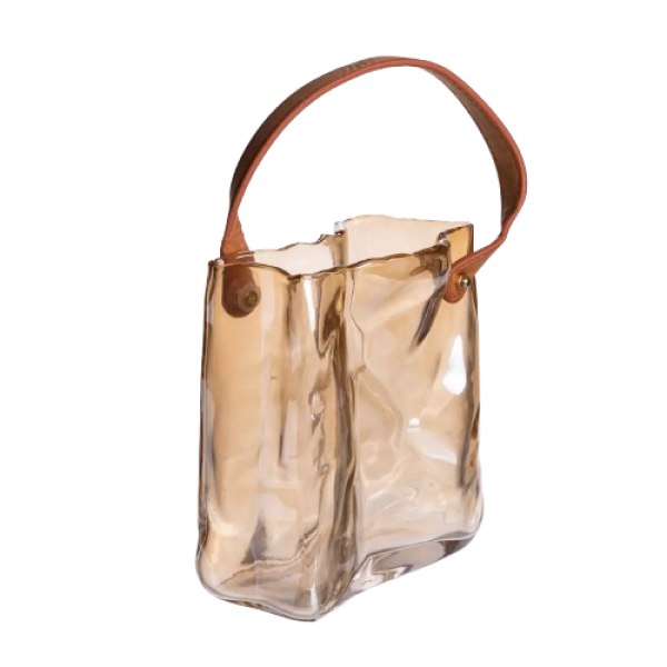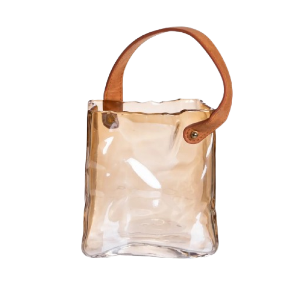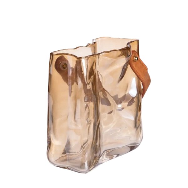 Ця стильна ваза поєднує у собі простоту форм та виразну фактуру: товстостінне скло плавно вигинається, створюючи м'які хвилі та гру світла. Невеликі нерівності та легка асиметрія підкреслюють ефект ручної роботи, роблячи вазу унікальною. Декоративна ручка з екошкіри додає теплоти та натуральної фактури, дозволяє легко переміщати виріб та використовувати його як акцентну деталь в інтер'єрі.