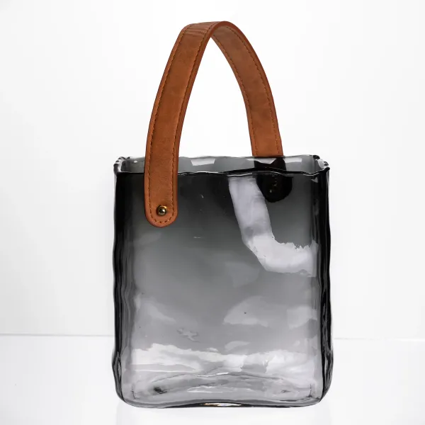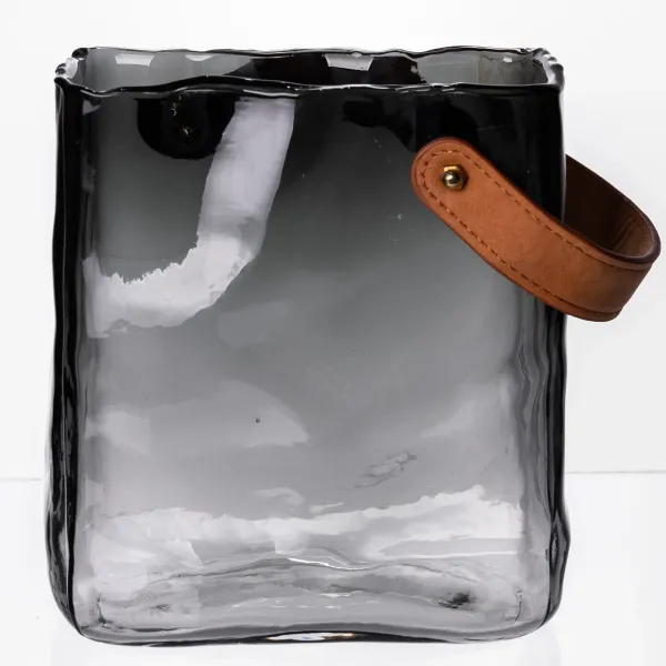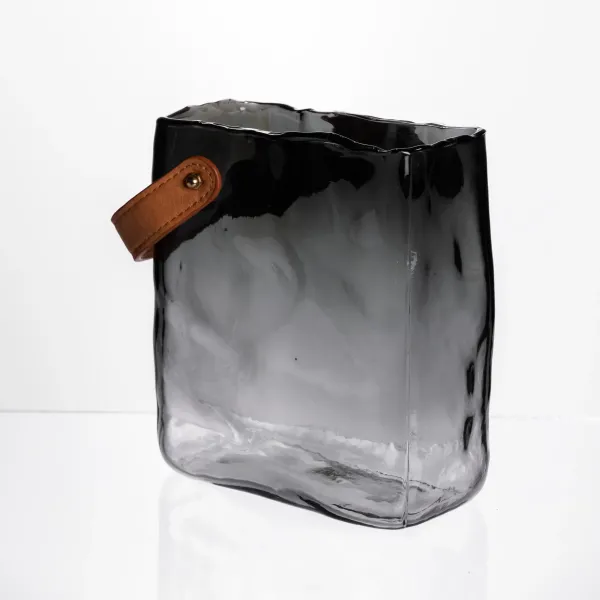 Ця стильна ваза поєднує у собі простоту форм та виразну фактуру: товстостінне скло плавно згинається, створюючи м'які хвилі та гру світла. Невеликі нерівності та легка асиметрія підкреслюють ефект ручної роботи, роблячи вазу унікальною. Декоративна ручка з екошкіри додає теплоти та натуральної фактури, дозволяє легко переміщати виріб та використовувати його як акцентну деталь в інтер'єрі.