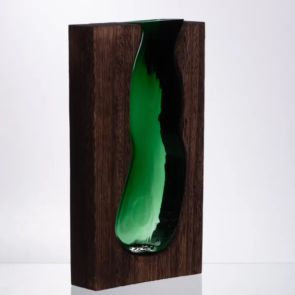 Ваза декоративна для квітів поєднує скло та дерево, створюючи гармонійний баланс природних матеріалів і сучасного дизайну. Скляна частина має плавні форми та насичений зелений колір, що ефектно контрастує з натуральною дерев’яною основою. Завдяки прозорому глянцевому склу ваза красиво відбиває світло, підкреслюючи форму і додаючи глибини композиції.