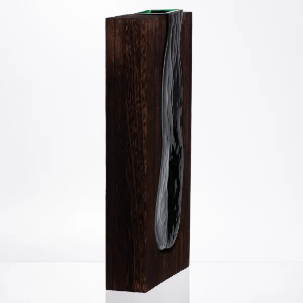 Дерев’яна частина виконана у вигляді прямокутного блоку з виїмкою під скло, що створює ефект обрамлення. Така конструкція робить вазу стійкою та надійною у використанні, а також додає виробу декоративної цінності — він може стати як частиною флористичної композиції, так і самостійним елементом декору. Поєднання гладкого скла та текстурованої деревини надає виробу оригінальності.