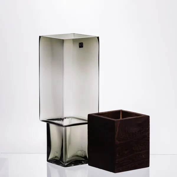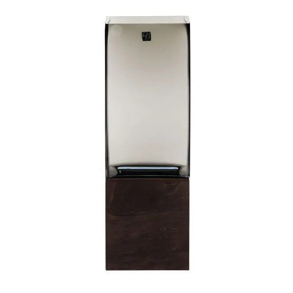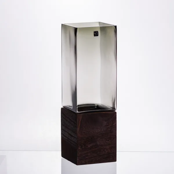 Декоративна ваза для квітів поєднує елегантність скла та природність дерева, створюючи витончений акцент для будь-якого інтер’єру. Висока скляна квадратна колба має поверхню з прямими лініями, які красиво заломлюють світло та підкреслюють форму виробу. Напівпрозоре скло з м’яким затемненням виглядає сучасно та стримано, що дозволяє вазі гармонійно поєднуватися з різними стилями оформлення простору.