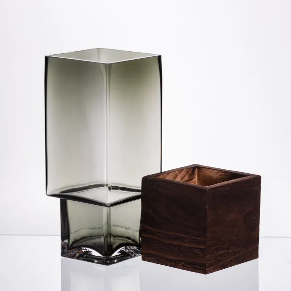 Декоративна ваза для квітів поєднує елегантність скла та природність дерева, створюючи витончений акцент для будь-якого інтер’єру. Висока скляна квадратна колба має поверхню з прямими лініями, які красиво заломлюють світло та підкреслюють форму виробу. Напівпрозоре скло з м’яким затемненням виглядає сучасно та стримано, що дозволяє вазі гармонійно поєднуватися з різними стилями оформлення простору.