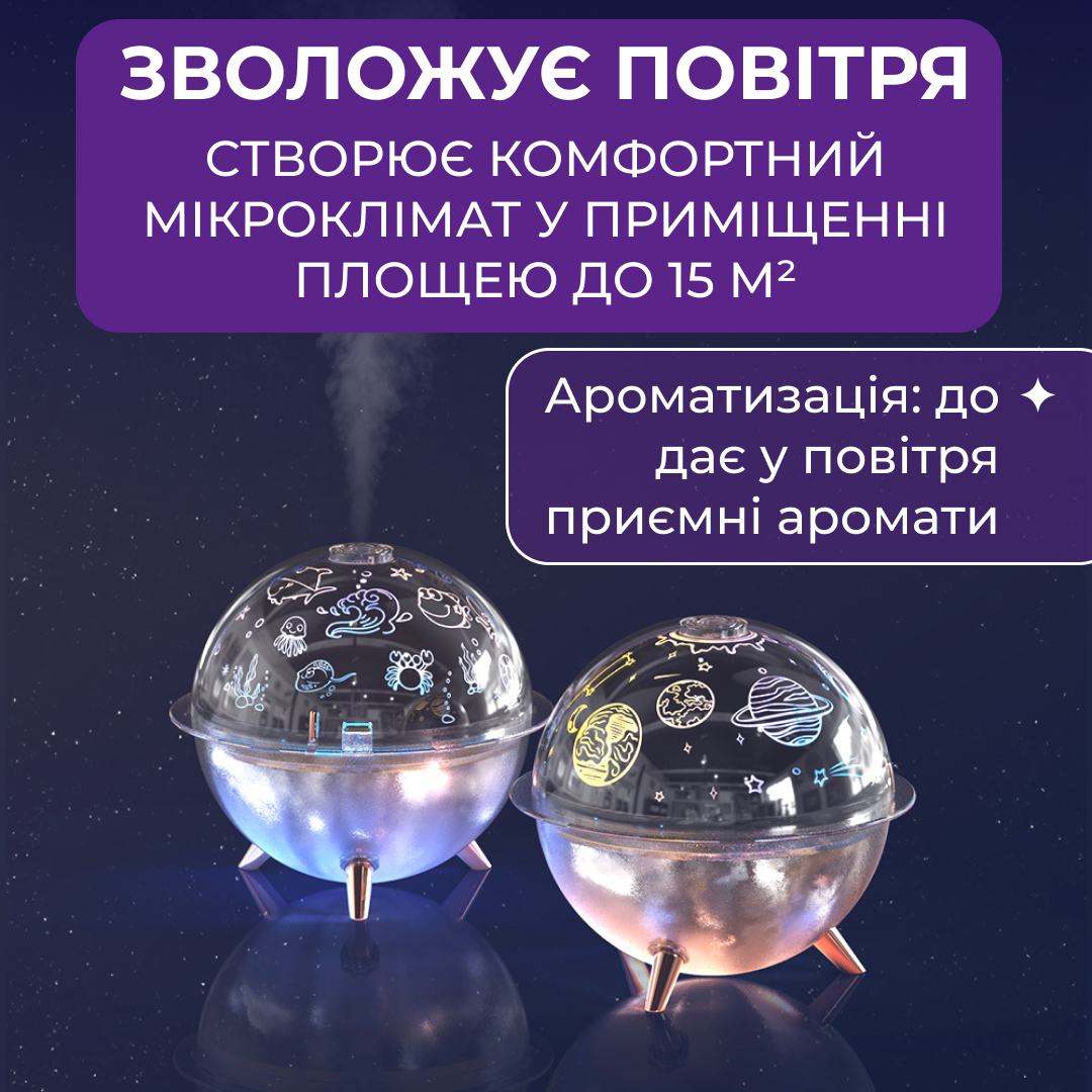 Бажаєте створити в кімнаті своєї дитини комфортну та затишну атмосферу? Тоді зволожувач повітря-нічник Star Lights Humidifier об'ємом 260 мл із проекцією – саме те, що потрібно. Пристрій має LED-підсвічування, яке проектує на стіни і стелю барвисті зображення сузір'їв і планет, завдяки чому малюк зможе засинати під зоряним небом, мріючи про далекі галактики.